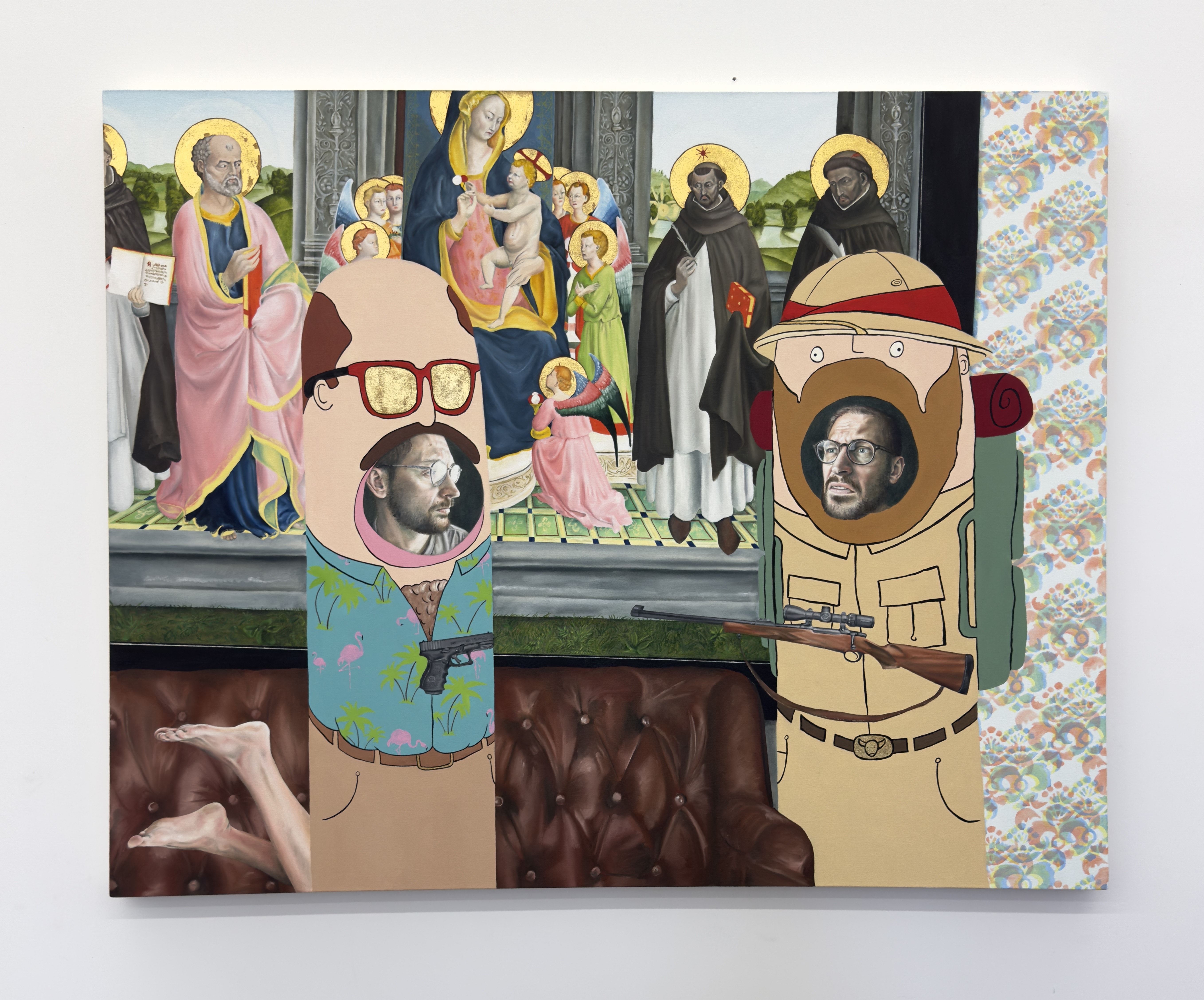In the creation of these paintings, I implement multiple styles to emphasize a point or create a separation of objects within the image. I borrow from art history to utilize a language that we already understood at some point in the lineage of culture, albeit a potentially in the form of pastiche, to speak to the contemporary. The intention is to simultaneously create the appearance of dissonance and a type of disguised relationship.